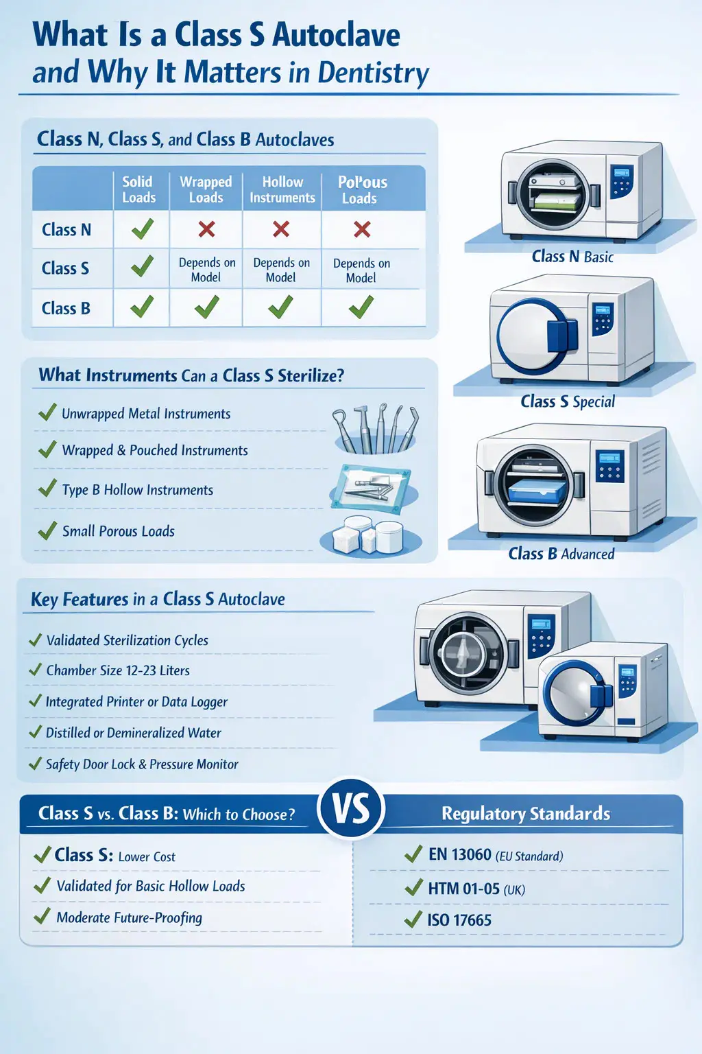S Sınıfı otoklav, sterilizasyon performansı açısından temel Sınıf N ile tam kapasiteli Sınıf B arasında yer alan, belirli, üretici tarafından tanımlanan yük aralığını işlemek üzere tasarlanmış bir buhar sterilizatörüdür. Diş hekimliği uygulamalarında, S Sınıfı otoklav en yaygın kullanılan sterilizasyon ünitelerinden biridir çünkü maliyet, döngü hızı ve herhangi bir diş kliniğinde standart olan içi boş ve gözenekli aletleri işleme yeteneği arasında pratik bir denge sunar.