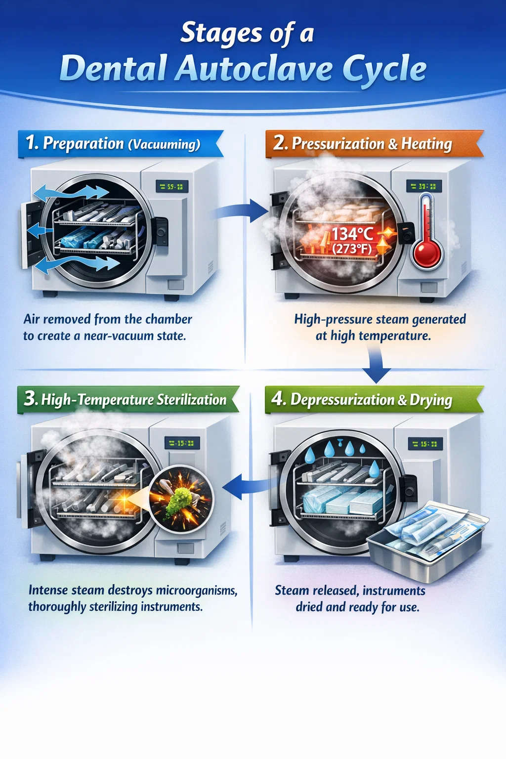 Kurutma fonksiyonu: Çıkarıldığında ıslak aletlerin neden olduğu ikincil kontaminasyonu önlemek için birçok diş otoklavı, kalan nemi gidermek için vakum pompasını tekrar çalıştırır. Soğutma ve çıkarma: Son olarak, odanın içindeki basınç dışarıdaki basınçla aynı seviyeye döner ve sıcaklık biraz düştüğünde doktorlar kuru, temiz alet paketlerini alabilirler.
