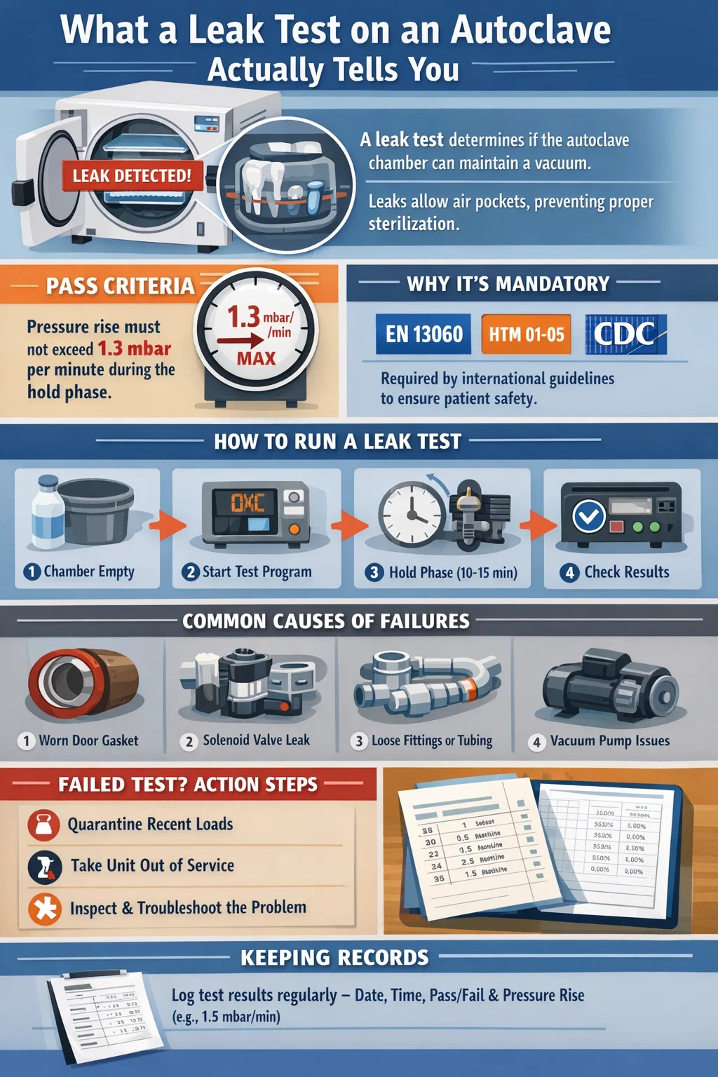 Birçok ülkedeki düzenleyici kurumlar ve mesleki standart kuruluşları, rutin otoklav doğrulamasının bir parçası olarak periyodik sızıntı testlerini zorunlu kılmaktadır. Dental ortamlarda kullanılanlar da dahil olmak üzere küçük buhar sterilizatörlerini düzenleyen Avrupa standardı EN 13060, yeterlilik ve rutin test protokolünün bir parçası olarak özellikle bir vakum sızıntı testi gerektirir. Birleşik Krallık'taki HTM 01-05 kılavuzu da benzer şekilde bunu zorunlu kılmaktadır. Amerika Birleşik Devletleri'nde, diş sağlığı bakım ortamlarında enfeksiyon kontrolüne yönelik CDC yönergeleri, evrensel olarak sızıntı testlerini de içeren sterilizatör testi için üreticinin talimatlarının takip edilmesini vurgulamaktadır.